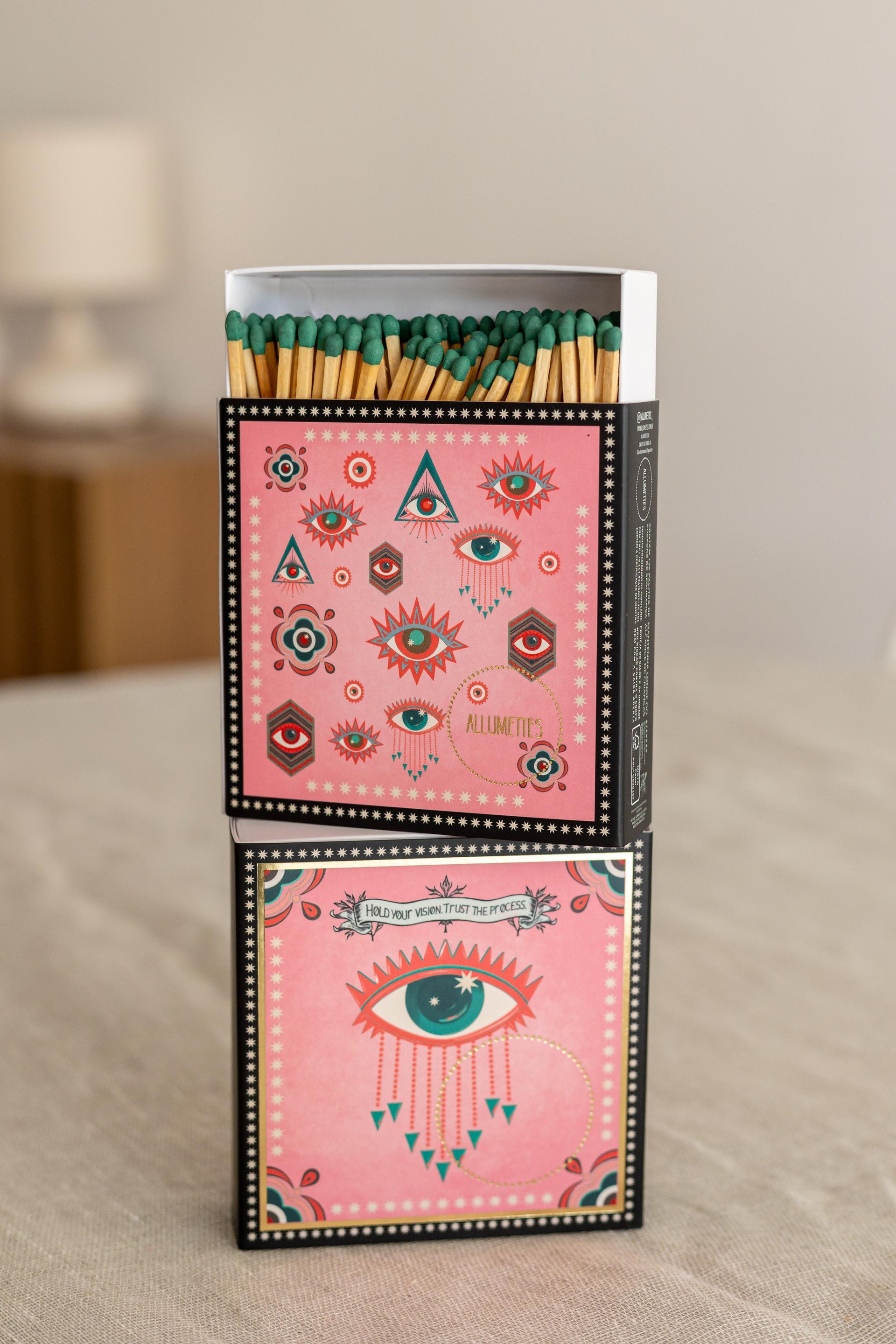 Em formato 11x11x3cm, contém 125 fósforos de segurança longos, com 10cm de comprimento. Acabamento gold e ilustração exclusiva.